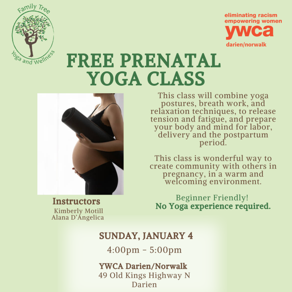 Join Family Tree Yoga & Wellness for a free prenatal yoga class at the YWCA, Sunday, 1/4/2026, 4:00-5:00pm. RSVP to attend.