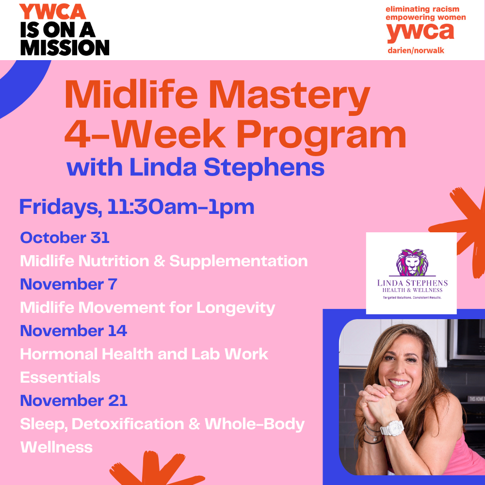 YWCA Darien Norwalk 49 Old Kings Hwy N, Darien, CTJoin Linda Stephens and her business partner Leann Kelly for a Midlife Mastery 4-week program. This program is designed to empower midlife women with practical strategies for nutrition, movement, hormonal health, and lifestyle choices that support long-term wellness. Week 1 – Friday, October 31 Midlife Nutrition & Supplementation Macronutrient needs for women in midlife Foods […]